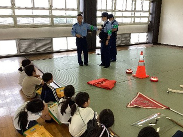 写真:警察署内の体育館で警察官の話を聞く子ども達