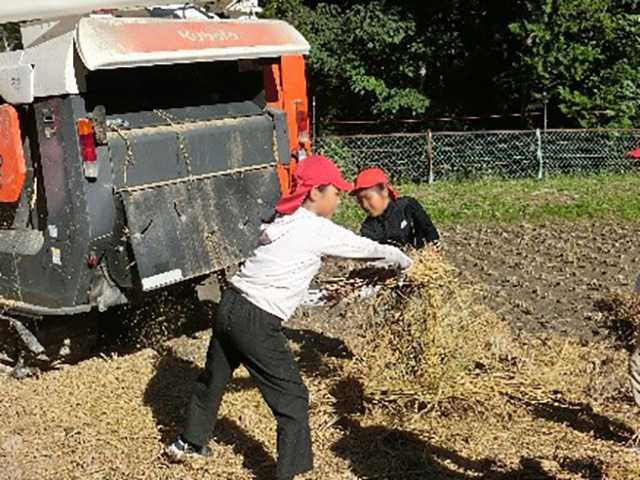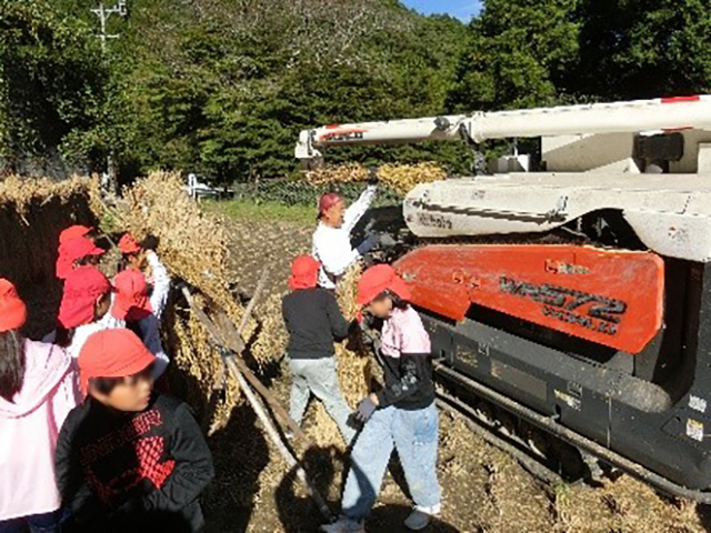 5月に田植えをして約4か月。稲穂は小麦色に大きく実り、重そうに垂れていました。田んぼの水の量を見たり、病気にかからないように薬を撒(ま)いたりと心を込めて育ててきました。そして、この日。晴天のもと、稲刈りをしました。