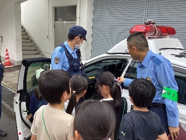 警察署では、ドラマでしか見たことがない鑑識をやらせてもらいました。指紋が浮き出る様子にびっくり。また、パトカーの中を見せてもらったり、警察官の仕事についてのお話を聞いたりしました。