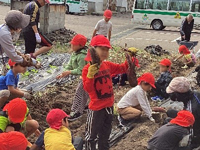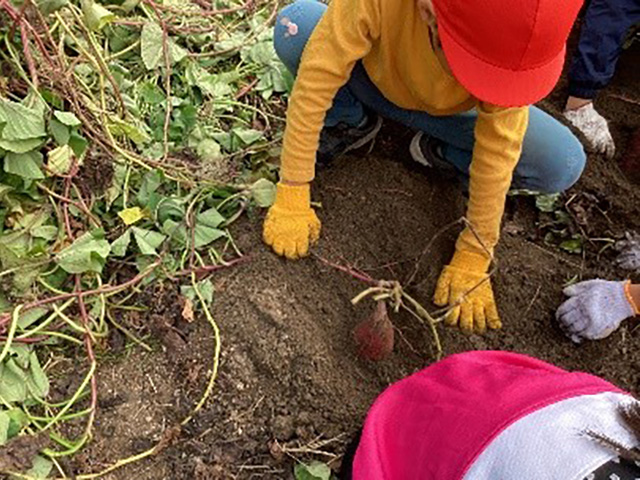 春に植えたサツマイモを収穫しました。太くて長いツルを引っ張っていくと、幾つもの大きなサツマイモが出てきました。紫色に輝くサツマイモと出会い、子どもたちは大喜びでした。