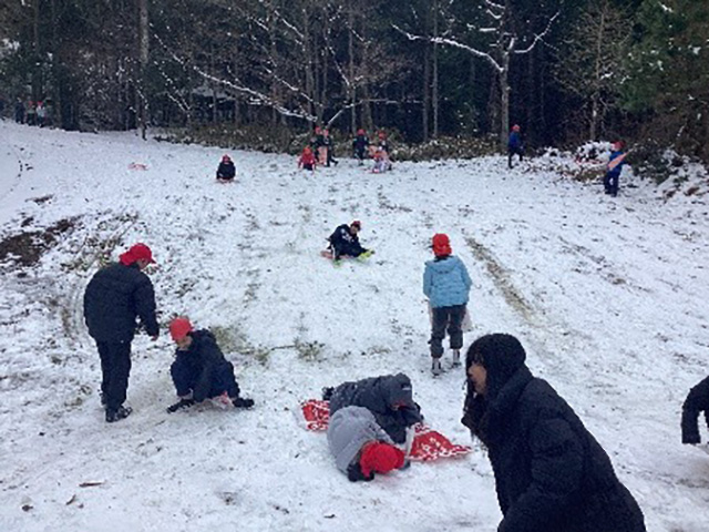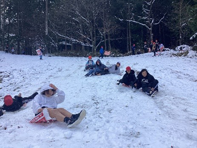 先日の寒波により東白川にも雪が降りました。学校の裏山にも多くの雪が積もり、斜面はまるでスキー場のようでした。