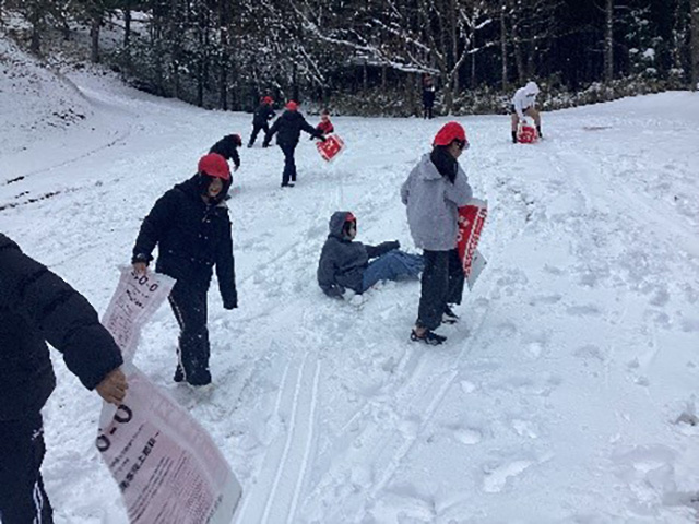 東白川小学校の風物詩、雪の上を滑る「そり滑り」。今年も始まりました。