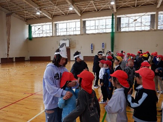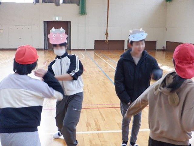写真:「鬼」や「福」のお面を着けた6年生とじゃんけん対決