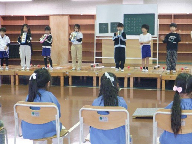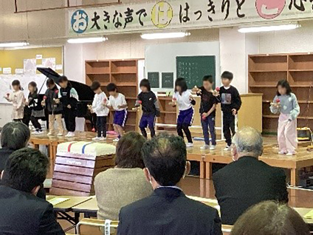 1年生が、年長さんと交流をしました。この1年間で学んだことやできるようになったことを発表しました。跳び箱やけん玉の技を披露した時、園児から「わー! 」「すごい! 」などの声が上がりました。その声を聞いて、1年生はさらに張り切って発表する姿につながりました。