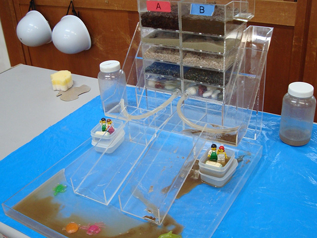 Aは水がゆっくりと浸透し、下層へとしみ落ちてろ過され、地下水脈に見立てたチューブを通って人形のある所へ流れ出る。