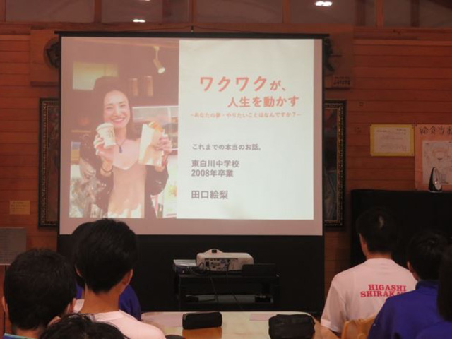 今年の『ようこそ先輩』は、2008年(平成20年)に東白川中学校を卒業された田口絵梨(平出身)さんをお招きし、自らの体験や今取り組んでいることなどのお話を聞きました。