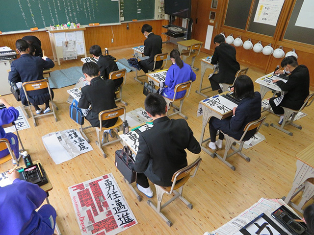 しかし、迷い、考え、自分で決めた四字熟語に自分の思いや決意を込め、書として表現するこの一連の行為そのものに意味があり、集中して取り組む生徒たちを見ているとうらやましく思うほどです。左義長で飾る機会もあると思いますが、読み方やその言葉を選んだ理由など聞いていただけると生徒たちの思いも新たになるかもしれませんね。
