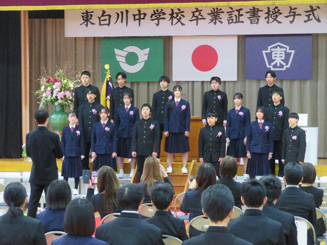 木製の素晴らしい卒業証書を胸に、堂々とした姿で立ち、感謝の思いや抱負を語りました。涙をこらえながらの卒業合唱『遥か』に、3年間の思いがぎゅっと凝縮されていました。保護者様、地域の方々に見守られ、無事に義務教育を終えることができました。お世話になった皆々様、誠にありがとうございました。