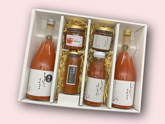 | 原材料 | ①トマト・玉ねぎ・塩・醸造酢・白山椒・みりん・砂糖 ②とまと・グラニュー糖 ③トマト・食塩 ④トマト ⑤トマト、玉ねぎ、にんじん、セロリ、オリーブオイル、にんにく、食塩、バジル、胡椒 ⑥玉ねぎ、ケチャップ、ホールトマト、オリーブオイル、砂糖、ガーリックパウダー、食塩、香辛料 |